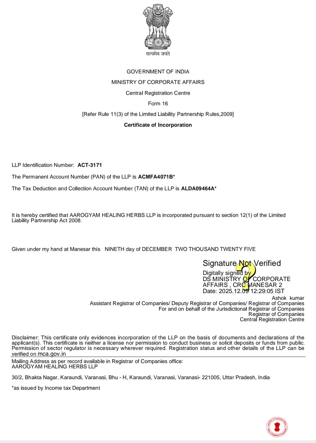 Ministry of Corporate Affairs Registration